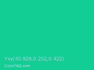 Yxy 45.929,0.252,0.422 Color is a normal green color and the nearest color is Caribbean Green #00cc99. Hex code #12cd94 and RGB value is rgb(18,205,148). In RGB color space, this color is composed of 7% red, 80% green, 58% blue, In CMYK color space, this color is composed of 91% cyan, 0% magenta, 28% yellow , 20% black , In HSL color space, this color has a hue angle of 162° , 84% saturation and 44% lightness.