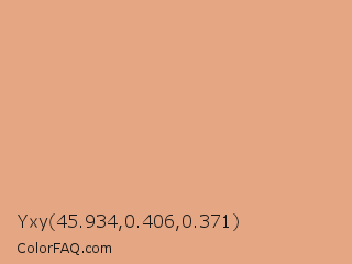 Yxy 45.934,0.406,0.371 Color is a light orange color and the nearest color is Tumbleweed #dea681. Hex code #e5a783 and RGB value is rgb(229,167,131). In RGB color space, this color is composed of 90% red, 65% green, 51% blue, In CMYK color space, this color is composed of 0% cyan, 27% magenta, 43% yellow , 10% black , In HSL color space, this color has a hue angle of 22° , 65% saturation and 71% lightness.