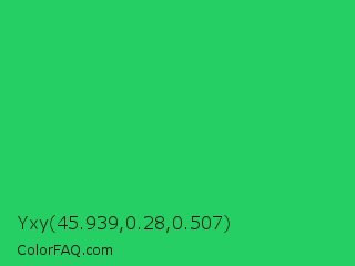 Yxy 45.939,0.28,0.507 Color is a normal green color and the nearest color is UFO Green #3cd070. Hex code #26cf63 and RGB value is rgb(38,207,99). In RGB color space, this color is composed of 15% red, 81% green, 39% blue, In CMYK color space, this color is composed of 82% cyan, 0% magenta, 52% yellow , 19% black , In HSL color space, this color has a hue angle of 142° , 69% saturation and 48% lightness.