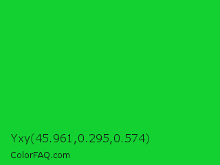 Yxy 45.961,0.295,0.574 Color is a normal green color and the nearest color is Vivid Malachite #00cc33. Hex code #13d131 and RGB value is rgb(19,209,49). In RGB color space, this color is composed of 7% red, 82% green, 19% blue, In CMYK color space, this color is composed of 91% cyan, 0% magenta, 77% yellow , 18% black , In HSL color space, this color has a hue angle of 129° , 83% saturation and 45% lightness.