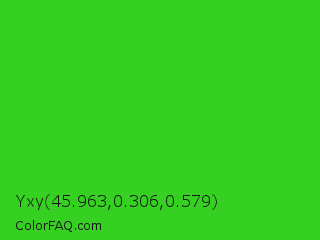 Yxy 45.963,0.306,0.579 Color is a normal green color and the nearest color is Lime Green #32cd32. Hex code #35d022 and RGB value is rgb(53,208,34). In RGB color space, this color is composed of 21% red, 82% green, 13% blue, In CMYK color space, this color is composed of 75% cyan, 0% magenta, 84% yellow , 18% black , In HSL color space, this color has a hue angle of 113° , 72% saturation and 47% lightness.