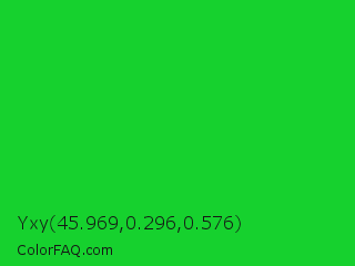 Yxy 45.969,0.296,0.576 Color is a normal green color and the nearest color is Vivid Malachite #00cc33. Hex code #16d12e and RGB value is rgb(22,209,46). In RGB color space, this color is composed of 9% red, 82% green, 18% blue, In CMYK color space, this color is composed of 89% cyan, 0% magenta, 78% yellow , 18% black , In HSL color space, this color has a hue angle of 128° , 81% saturation and 45% lightness.