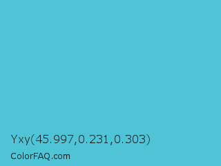 Yxy 45.997,0.231,0.303 Color is a normal cyan color and the nearest color is Sea Serpent #4bc7cf. Hex code #4ec4d6 and RGB value is rgb(78,196,214). In RGB color space, this color is composed of 31% red, 77% green, 84% blue, In CMYK color space, this color is composed of 64% cyan, 8% magenta, 0% yellow , 16% black , In HSL color space, this color has a hue angle of 188° , 62% saturation and 57% lightness.
