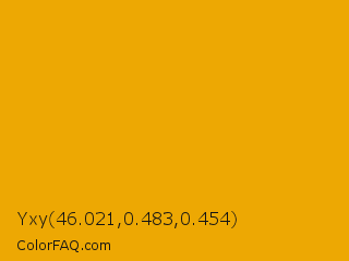Yxy 46.021,0.483,0.454 Color is a normal orange color and the nearest color is Yellow Sea #fea904. Hex code #eda803 and RGB value is rgb(237,168,3). In RGB color space, this color is composed of 93% red, 66% green, 1% blue, In CMYK color space, this color is composed of 0% cyan, 29% magenta, 99% yellow , 7% black , In HSL color space, this color has a hue angle of 42° , 98% saturation and 47% lightness.