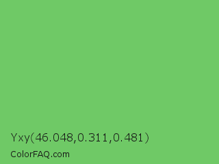Yxy 46.048,0.311,0.481 Color is a normal green color and the nearest color is Mantis #74c365. Hex code #6fc966 and RGB value is rgb(111,201,102). In RGB color space, this color is composed of 44% red, 79% green, 40% blue, In CMYK color space, this color is composed of 45% cyan, 0% magenta, 49% yellow , 21% black , In HSL color space, this color has a hue angle of 115° , 48% saturation and 59% lightness.
