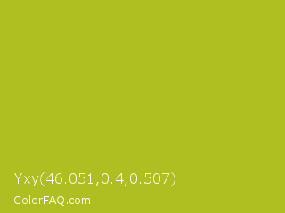 Yxy 46.051,0.4,0.507 Color is a normal yellow color and the nearest color is Acid Green #b0bf1a. Hex code #afbe21 and RGB value is rgb(175,190,33). In RGB color space, this color is composed of 69% red, 75% green, 13% blue, In CMYK color space, this color is composed of 8% cyan, 0% magenta, 83% yellow , 25% black , In HSL color space, this color has a hue angle of 66° , 70% saturation and 44% lightness.
