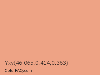Yxy 46.065,0.414,0.363 Color is a light orange color and the nearest color is Tonys Pink #e79f8c. Hex code #eea385 and RGB value is rgb(238,163,133). In RGB color space, this color is composed of 93% red, 64% green, 52% blue, In CMYK color space, this color is composed of 0% cyan, 32% magenta, 44% yellow , 7% black , In HSL color space, this color has a hue angle of 17° , 76% saturation and 73% lightness.