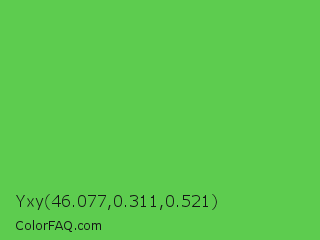 Yxy 46.077,0.311,0.521 Color is a normal green color and the nearest color is Mantis #74c365. Hex code #5dcc4f and RGB value is rgb(93,204,79). In RGB color space, this color is composed of 36% red, 80% green, 31% blue, In CMYK color space, this color is composed of 54% cyan, 0% magenta, 61% yellow , 20% black , In HSL color space, this color has a hue angle of 113° , 55% saturation and 55% lightness.