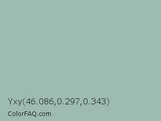 Yxy 46.086,0.297,0.343 Color is a light green color and the nearest color is Cambridge Blue #a3c1ad. Hex code #9ebbb1 and RGB value is rgb(158,187,177). In RGB color space, this color is composed of 62% red, 73% green, 69% blue, In CMYK color space, this color is composed of 16% cyan, 0% magenta, 5% yellow , 27% black , In HSL color space, this color has a hue angle of 159° , 18% saturation and 68% lightness.