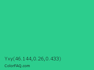 Yxy 46.144,0.26,0.433 Color is a normal green color and the nearest color is Shamrock #33cc99. Hex code #2ccd8d and RGB value is rgb(44,205,141). In RGB color space, this color is composed of 17% red, 80% green, 55% blue, In CMYK color space, this color is composed of 79% cyan, 0% magenta, 31% yellow , 20% black , In HSL color space, this color has a hue angle of 156° , 65% saturation and 49% lightness.