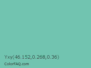 Yxy 46.152,0.268,0.36 Color is a light cyan color and the nearest color is Neptune #7cb7bb. Hex code #71c4af and RGB value is rgb(113,196,175). In RGB color space, this color is composed of 44% red, 77% green, 69% blue, In CMYK color space, this color is composed of 42% cyan, 0% magenta, 11% yellow , 23% black , In HSL color space, this color has a hue angle of 165° , 41% saturation and 61% lightness.