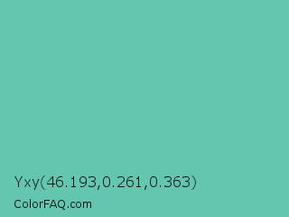 Yxy 46.193,0.261,0.363 Color is a normal cyan color and the nearest color is Tradewind #5fb3ac. Hex code #64c6af and RGB value is rgb(100,198,175). In RGB color space, this color is composed of 39% red, 78% green, 69% blue, In CMYK color space, this color is composed of 49% cyan, 0% magenta, 12% yellow , 22% black , In HSL color space, this color has a hue angle of 166° , 46% saturation and 58% lightness.