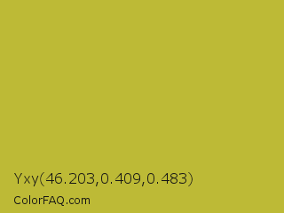 Yxy 46.203,0.409,0.483 Color is a normal yellow color and the nearest color is Earls Green #c9b93b. Hex code #bdba36 and RGB value is rgb(189,186,54). In RGB color space, this color is composed of 74% red, 73% green, 21% blue, In CMYK color space, this color is composed of 0% cyan, 2% magenta, 71% yellow , 26% black , In HSL color space, this color has a hue angle of 59° , 56% saturation and 48% lightness.
