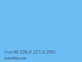 Yxy 46.239,0.227,0.256 Color is a light blue color and the nearest color is Very Light Azure #74bbfb. Hex code #6dbdf5 and RGB value is rgb(109,189,245). In RGB color space, this color is composed of 43% red, 74% green, 96% blue, In CMYK color space, this color is composed of 56% cyan, 23% magenta, 0% yellow , 4% black , In HSL color space, this color has a hue angle of 205° , 87% saturation and 69% lightness.