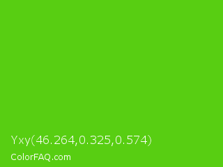 Yxy 46.264,0.325,0.574 Color is a normal green color and the nearest color is Harlequin Green #46cb18. Hex code #58ce12 and RGB value is rgb(88,206,18). In RGB color space, this color is composed of 35% red, 81% green, 7% blue, In CMYK color space, this color is composed of 57% cyan, 0% magenta, 91% yellow , 19% black , In HSL color space, this color has a hue angle of 98° , 84% saturation and 44% lightness.