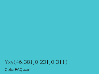 Yxy 46.381,0.231,0.311 Color is a normal cyan color and the nearest color is Sea Serpent #4bc7cf. Hex code #47c6d2 and RGB value is rgb(71,198,210). In RGB color space, this color is composed of 28% red, 78% green, 82% blue, In CMYK color space, this color is composed of 66% cyan, 6% magenta, 0% yellow , 18% black , In HSL color space, this color has a hue angle of 185° , 61% saturation and 55% lightness.