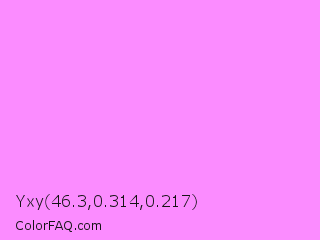 Yxy 46.3,0.314,0.217 Color is a light magenta color and the nearest color is Light Fuchsia Pink #f984ef. Hex code #fb8cff and RGB value is rgb(251,140,255). In RGB color space, this color is composed of 98% red, 55% green, 100% blue, In CMYK color space, this color is composed of 2% cyan, 45% magenta, 0% yellow , 0% black , In HSL color space, this color has a hue angle of 298° , 100% saturation and 77% lightness.