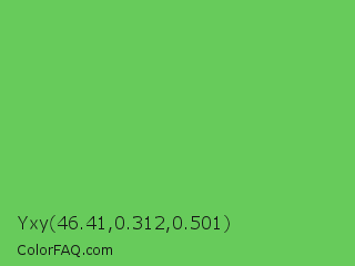 Yxy 46.41,0.312,0.501 Color is a normal green color and the nearest color is Mantis #74c365. Hex code #67cb5b and RGB value is rgb(103,203,91). In RGB color space, this color is composed of 40% red, 80% green, 36% blue, In CMYK color space, this color is composed of 49% cyan, 0% magenta, 55% yellow , 20% black , In HSL color space, this color has a hue angle of 114° , 52% saturation and 58% lightness.