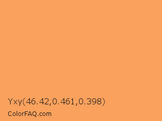 Yxy 46.42,0.461,0.398 Color is a light orange color and the nearest color is Tan Hide #fa9d5a. Hex code #f9a15d and RGB value is rgb(249,161,93). In RGB color space, this color is composed of 98% red, 63% green, 36% blue, In CMYK color space, this color is composed of 0% cyan, 35% magenta, 63% yellow , 2% black , In HSL color space, this color has a hue angle of 26° , 93% saturation and 67% lightness.