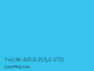 Yxy 46.435,0.215,0.273 Color is a normal cyan color and the nearest color is Picton Blue #45b1e8. Hex code #36c4ed and RGB value is rgb(54,196,237). In RGB color space, this color is composed of 21% red, 77% green, 93% blue, In CMYK color space, this color is composed of 77% cyan, 17% magenta, 0% yellow , 7% black , In HSL color space, this color has a hue angle of 193° , 84% saturation and 57% lightness.