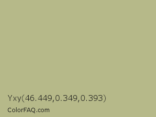 Yxy 46.449,0.349,0.393 Color is a light yellow color and the nearest color is Sage #bcb88a. Hex code #b6b989 and RGB value is rgb(182,185,137). In RGB color space, this color is composed of 71% red, 73% green, 54% blue, In CMYK color space, this color is composed of 2% cyan, 0% magenta, 26% yellow , 27% black , In HSL color space, this color has a hue angle of 64° , 26% saturation and 63% lightness.
