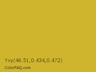 Yxy 46.51,0.434,0.472 Color is a normal yellow color and the nearest color is Gold Metallic #d4af37. Hex code #cfb52e and RGB value is rgb(207,181,46). In RGB color space, this color is composed of 81% red, 71% green, 18% blue, In CMYK color space, this color is composed of 0% cyan, 13% magenta, 78% yellow , 19% black , In HSL color space, this color has a hue angle of 50° , 64% saturation and 50% lightness.