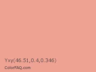 Yxy 46.51,0.4,0.346 Color is a light red color and the nearest color is Tonys Pink #e79f8c. Hex code #eea394 and RGB value is rgb(238,163,148). In RGB color space, this color is composed of 93% red, 64% green, 58% blue, In CMYK color space, this color is composed of 0% cyan, 32% magenta, 38% yellow , 7% black , In HSL color space, this color has a hue angle of 10° , 73% saturation and 76% lightness.