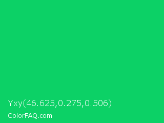 Yxy 46.625,0.275,0.506 Color is a normal green color and the nearest color is Malachite #0bda51. Hex code #0cd166 and RGB value is rgb(12,209,102). In RGB color space, this color is composed of 5% red, 82% green, 40% blue, In CMYK color space, this color is composed of 94% cyan, 0% magenta, 51% yellow , 18% black , In HSL color space, this color has a hue angle of 147° , 89% saturation and 43% lightness.
