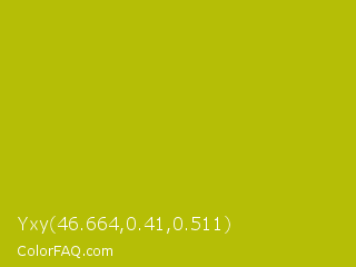 Yxy 46.664,0.41,0.511 Color is a normal yellow color and the nearest color is La Rioja #b3c110. Hex code #b5be06 and RGB value is rgb(181,190,6). In RGB color space, this color is composed of 71% red, 75% green, 2% blue, In CMYK color space, this color is composed of 5% cyan, 0% magenta, 97% yellow , 25% black , In HSL color space, this color has a hue angle of 63° , 94% saturation and 38% lightness.