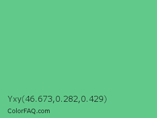 Yxy 46.673,0.282,0.429 Color is a normal green color and the nearest color is Silver Tree #66b58f. Hex code #61ca8a and RGB value is rgb(97,202,138). In RGB color space, this color is composed of 38% red, 79% green, 54% blue, In CMYK color space, this color is composed of 52% cyan, 0% magenta, 32% yellow , 21% black , In HSL color space, this color has a hue angle of 143° , 50% saturation and 59% lightness.