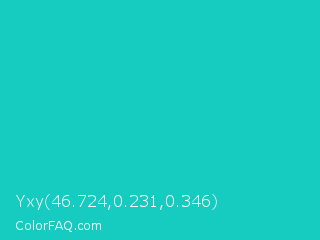 Yxy 46.724,0.231,0.346 Color is a normal cyan color and the nearest color is Java #1fc2c2. Hex code #16cbc0 and RGB value is rgb(22,203,192). In RGB color space, this color is composed of 9% red, 80% green, 75% blue, In CMYK color space, this color is composed of 89% cyan, 0% magenta, 5% yellow , 20% black , In HSL color space, this color has a hue angle of 176° , 80% saturation and 44% lightness.
