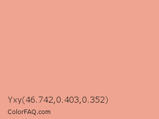 Yxy 46.742,0.403,0.352 Color is a light red color and the nearest color is Tonys Pink #e79f8c. Hex code #eea490 and RGB value is rgb(238,164,144). In RGB color space, this color is composed of 93% red, 64% green, 56% blue, In CMYK color space, this color is composed of 0% cyan, 31% magenta, 39% yellow , 7% black , In HSL color space, this color has a hue angle of 13° , 73% saturation and 75% lightness.