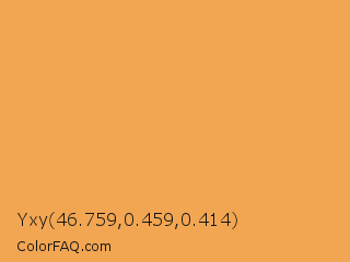 Yxy 46.759,0.459,0.414 Color is a light orange color and the nearest color is Sandy Brown #f4a460. Hex code #f2a652 and RGB value is rgb(242,166,82). In RGB color space, this color is composed of 95% red, 65% green, 32% blue, In CMYK color space, this color is composed of 0% cyan, 31% magenta, 66% yellow , 5% black , In HSL color space, this color has a hue angle of 32° , 86% saturation and 64% lightness.