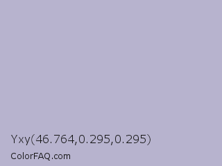 Yxy 46.764,0.295,0.295 Color is a light indigo color and the nearest color is Chatelle #bdb3c7. Hex code #b7b3ce and RGB value is rgb(183,179,206). In RGB color space, this color is composed of 72% red, 70% green, 81% blue, In CMYK color space, this color is composed of 11% cyan, 13% magenta, 0% yellow , 19% black , In HSL color space, this color has a hue angle of 249° , 22% saturation and 75% lightness.