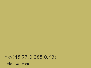 Yxy 46.77,0.385,0.43 Color is a normal yellow color and the nearest color is Dark Khaki #bdb76b. Hex code #c2b869 and RGB value is rgb(194,184,105). In RGB color space, this color is composed of 76% red, 72% green, 41% blue, In CMYK color space, this color is composed of 0% cyan, 5% magenta, 46% yellow , 24% black , In HSL color space, this color has a hue angle of 53° , 42% saturation and 59% lightness.