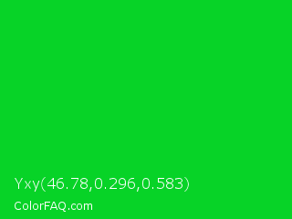 Yxy 46.78,0.296,0.583 Color is a normal green color and the nearest color is Vivid Malachite #00cc33. Hex code #07d327 and RGB value is rgb(7,211,39). In RGB color space, this color is composed of 3% red, 83% green, 15% blue, In CMYK color space, this color is composed of 97% cyan, 0% magenta, 82% yellow , 17% black , In HSL color space, this color has a hue angle of 129° , 94% saturation and 43% lightness.