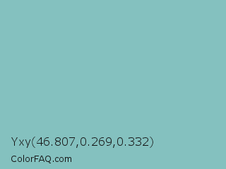 Yxy 46.807,0.269,0.332 Color is a light cyan color and the nearest color is Half Baked #85c4cc. Hex code #84c1bf and RGB value is rgb(132,193,191). In RGB color space, this color is composed of 52% red, 76% green, 75% blue, In CMYK color space, this color is composed of 32% cyan, 0% magenta, 1% yellow , 24% black , In HSL color space, this color has a hue angle of 178° , 33% saturation and 64% lightness.