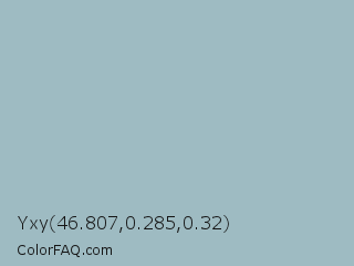 Yxy 46.807,0.285,0.32 Color is a light cyan color and the nearest color is Tower Gray #a9bdbf. Hex code #9ebbc2 and RGB value is rgb(158,187,194). In RGB color space, this color is composed of 62% red, 73% green, 76% blue, In CMYK color space, this color is composed of 19% cyan, 4% magenta, 0% yellow , 24% black , In HSL color space, this color has a hue angle of 192° , 23% saturation and 69% lightness.
