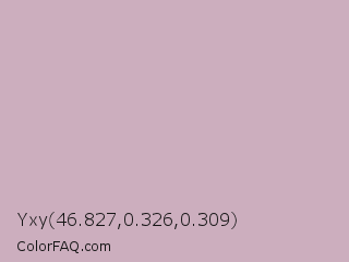 Yxy 46.827,0.326,0.309 Color is a light rose color and the nearest color is Lily #c8aabf. Hex code #ccaebe and RGB value is rgb(204,174,190). In RGB color space, this color is composed of 80% red, 68% green, 75% blue, In CMYK color space, this color is composed of 0% cyan, 15% magenta, 7% yellow , 20% black , In HSL color space, this color has a hue angle of 328° , 23% saturation and 74% lightness.