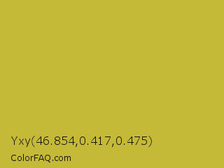 Yxy 46.854,0.417,0.475 Color is a normal yellow color and the nearest color is Earls Green #c9b93b. Hex code #c5b938 and RGB value is rgb(197,185,56). In RGB color space, this color is composed of 77% red, 73% green, 22% blue, In CMYK color space, this color is composed of 0% cyan, 6% magenta, 72% yellow , 23% black , In HSL color space, this color has a hue angle of 55° , 56% saturation and 50% lightness.