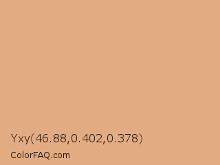 Yxy 46.88,0.402,0.378 Color is a light orange color and the nearest color is Tumbleweed #dea681. Hex code #e2ab81 and RGB value is rgb(226,171,129). In RGB color space, this color is composed of 89% red, 67% green, 51% blue, In CMYK color space, this color is composed of 0% cyan, 24% magenta, 43% yellow , 11% black , In HSL color space, this color has a hue angle of 26° , 63% saturation and 70% lightness.