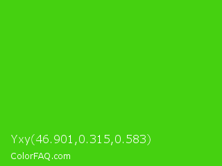 Yxy 46.901,0.315,0.583 Color is a normal green color and the nearest color is Harlequin Green #46cb18. Hex code #45d110 and RGB value is rgb(69,209,16). In RGB color space, this color is composed of 27% red, 82% green, 6% blue, In CMYK color space, this color is composed of 67% cyan, 0% magenta, 92% yellow , 18% black , In HSL color space, this color has a hue angle of 104° , 86% saturation and 44% lightness.