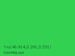 Yxy 46.914,0.291,0.531 Color is a normal green color and the nearest color is UFO Green #3cd070. Hex code #33d152 and RGB value is rgb(51,209,82). In RGB color space, this color is composed of 20% red, 82% green, 32% blue, In CMYK color space, this color is composed of 76% cyan, 0% magenta, 61% yellow , 18% black , In HSL color space, this color has a hue angle of 132° , 63% saturation and 51% lightness.
