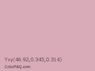 Yxy 46.92,0.345,0.314 Color is a light rose color and the nearest color is Pale Chestnut #ddadaf. Hex code #d9aab7 and RGB value is rgb(217,170,183). In RGB color space, this color is composed of 85% red, 67% green, 72% blue, In CMYK color space, this color is composed of 0% cyan, 22% magenta, 16% yellow , 15% black , In HSL color space, this color has a hue angle of 343° , 38% saturation and 76% lightness.