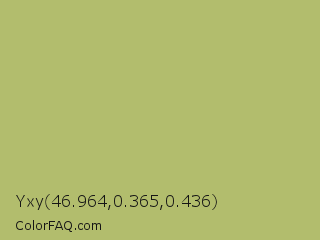 Yxy 46.964,0.365,0.436 Color is a normal yellow color and the nearest color is Wild Willow #b9c46a. Hex code #b2bd6d and RGB value is rgb(178,189,109). In RGB color space, this color is composed of 70% red, 74% green, 43% blue, In CMYK color space, this color is composed of 6% cyan, 0% magenta, 42% yellow , 26% black , In HSL color space, this color has a hue angle of 68° , 38% saturation and 58% lightness.