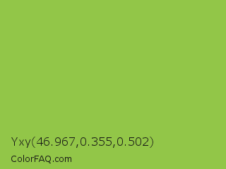 Yxy 46.967,0.355,0.502 Color is a normal green color and the nearest color is Android Green #a4c639. Hex code #92c648 and RGB value is rgb(146,198,72). In RGB color space, this color is composed of 57% red, 78% green, 28% blue, In CMYK color space, this color is composed of 26% cyan, 0% magenta, 64% yellow , 22% black , In HSL color space, this color has a hue angle of 85° , 53% saturation and 53% lightness.