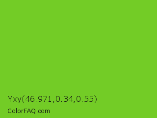 Yxy 46.971,0.34,0.55 Color is a normal green color and the nearest color is Lima #76bd17. Hex code #73cc26 and RGB value is rgb(115,204,38). In RGB color space, this color is composed of 45% red, 80% green, 15% blue, In CMYK color space, this color is composed of 44% cyan, 0% magenta, 81% yellow , 20% black , In HSL color space, this color has a hue angle of 92° , 69% saturation and 47% lightness.