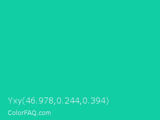 Yxy 46.978,0.244,0.394 Color is a normal cyan color and the nearest color is Caribbean Green #00cc99. Hex code #11cea5 and RGB value is rgb(17,206,165). In RGB color space, this color is composed of 7% red, 81% green, 65% blue, In CMYK color space, this color is composed of 92% cyan, 0% magenta, 20% yellow , 19% black , In HSL color space, this color has a hue angle of 167° , 85% saturation and 44% lightness.