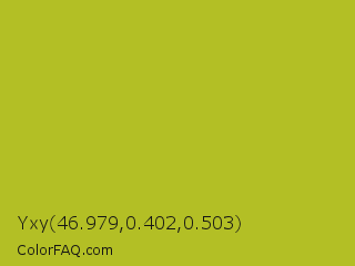 Yxy 46.979,0.402,0.503 Color is a normal yellow color and the nearest color is Acid Green #b0bf1a. Hex code #b3bf25 and RGB value is rgb(179,191,37). In RGB color space, this color is composed of 70% red, 75% green, 15% blue, In CMYK color space, this color is composed of 6% cyan, 0% magenta, 81% yellow , 25% black , In HSL color space, this color has a hue angle of 65° , 68% saturation and 45% lightness.