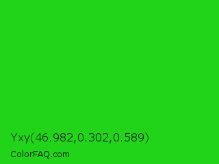 Yxy 46.982,0.302,0.589 Color is a normal green color and the nearest color is Lime Green #32cd32. Hex code #21d319 and RGB value is rgb(33,211,25). In RGB color space, this color is composed of 13% red, 83% green, 10% blue, In CMYK color space, this color is composed of 84% cyan, 0% magenta, 88% yellow , 17% black , In HSL color space, this color has a hue angle of 117° , 79% saturation and 46% lightness.